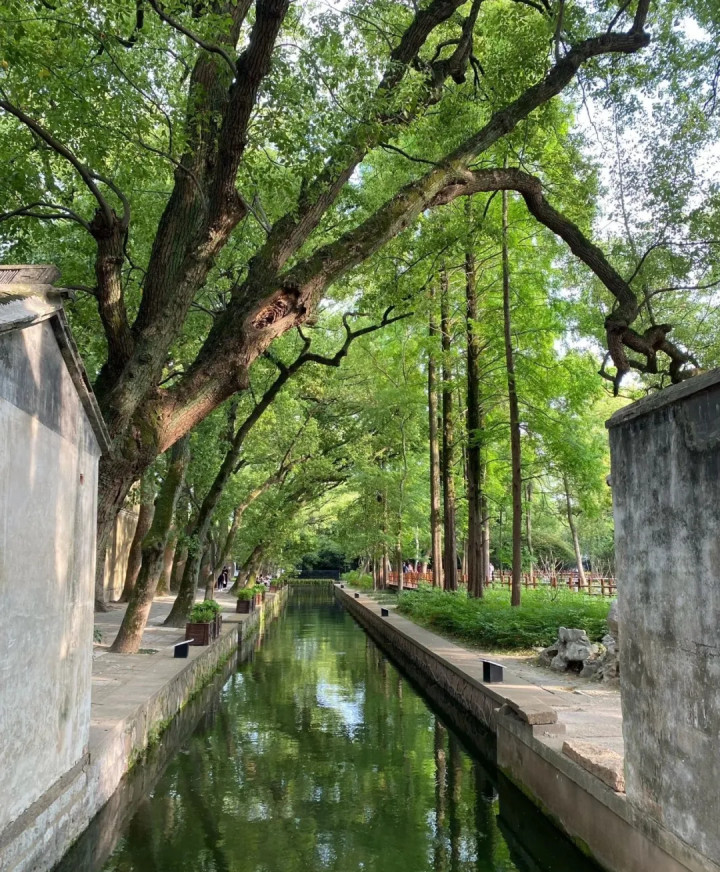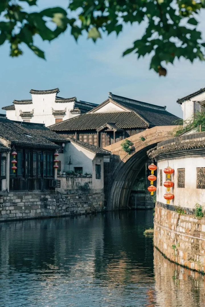 长发桥:桥🌉搭配岸边的绿树和陈旧的房屋店铺,树荫斑驳打在墙上,春天碧绿的树叶随风摇曳,一片岁月静好的形式。