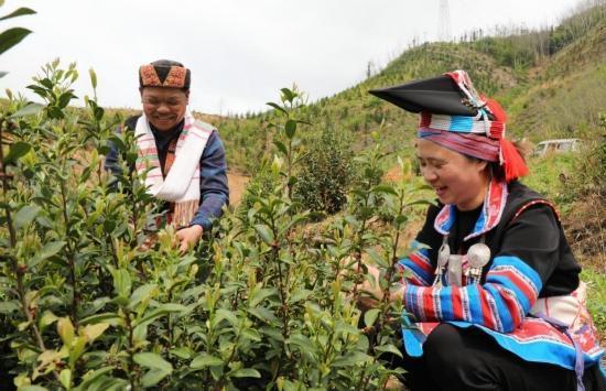春山浅笑,茶香漫谷。趁着天气晴好,10余位村民背着竹篓、唱着牧歌,沿着山间路迂曲而上,走向山上的茶园。