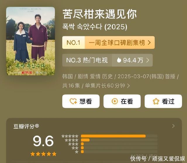 摈弃目下,《苦尽柑来碰见你》的豆瓣评分照旧高潮到9.6分,成为豆瓣韩剧史评分第二名,前三名分裂是:《请酬金1988》《苦尽柑来碰见你》《搞笑一家东说念主》。